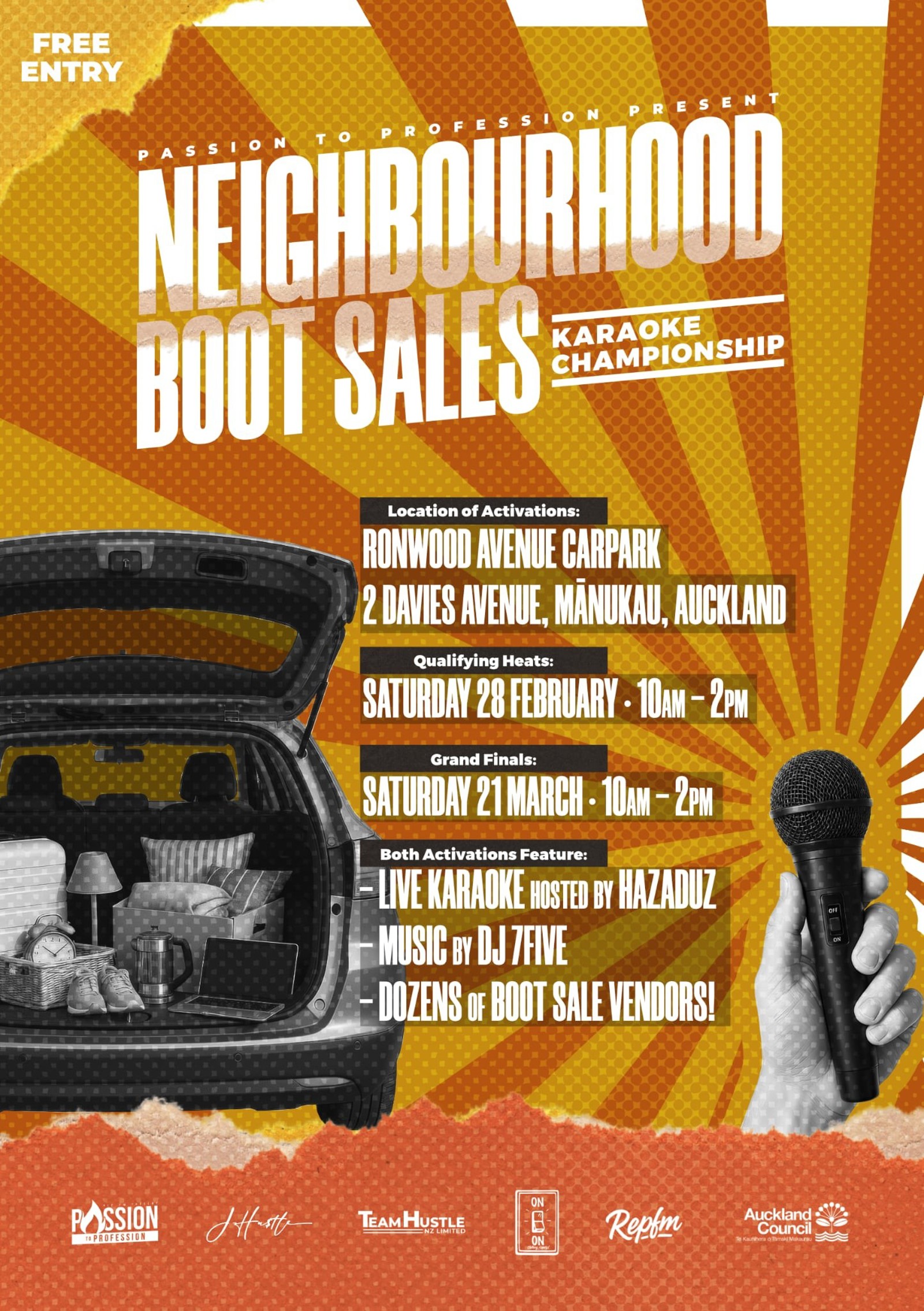 Make sure you make it to the Manukau neighbourhood car boot sale & karaoke championship.