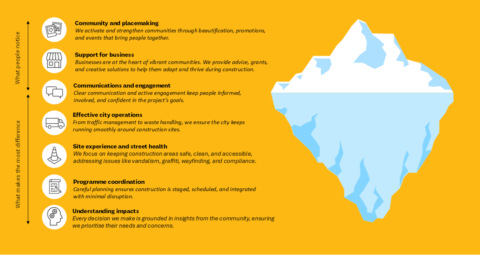 The iceberg model was developed based on what our customers told us they care about, and what makes the most difference to them. The most visible aspects of caring for our project neighbours are often things like communications and engagement, activation and placemaking, and business support programmes. But the actions we take behind the scenes are often the things that have the greatest positive influence on how people experience the work we do.