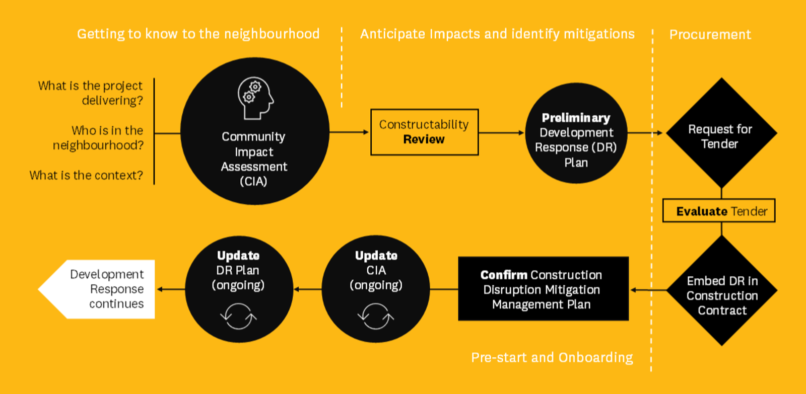 The ideal time to begin drafting your project-specific Development Response plan is at the start of your procurement phase. Informed by your project plans, designs, constructability review and Community Impact Assessment, you’ll begin to outline how your plan for embedding Development Response into your project delivery plan.