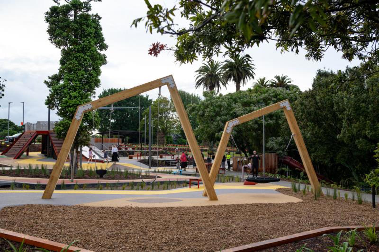 The design of the play space is shaped by the Mana Whenua narrative ‘The Mists of Kohuora,’ features undulating mounds and volcanic-themed cushion-fall areas weaving around the existing trees and new planting areas to create a naturalised experience. A constructed swale with user-activated misters adds a playful and poetic nod to the area’s naturally misty landscape.