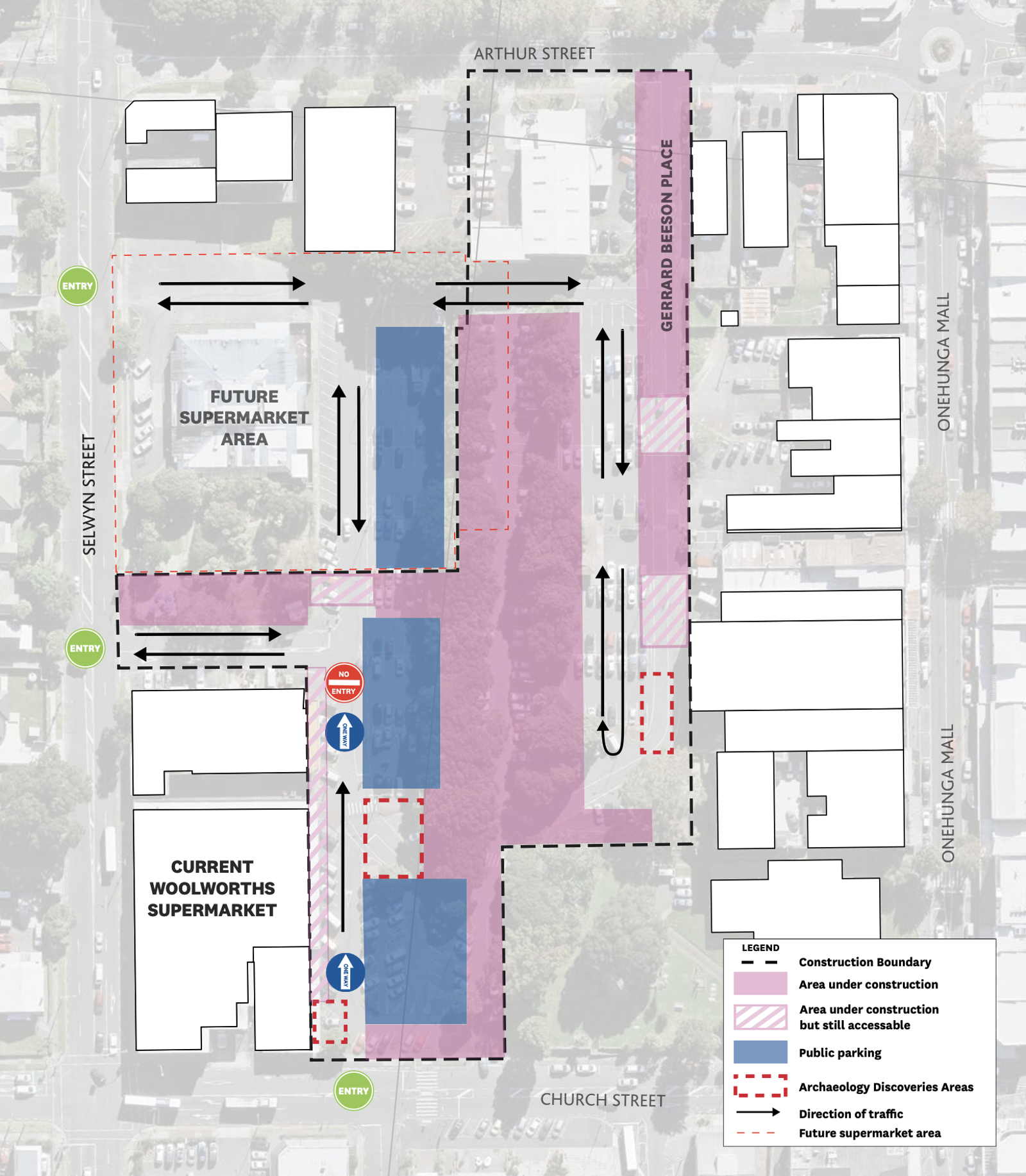 While the application for an overall authority is being progressed, work cannot continue in the specific areas where midden has been discovered. To help reduce disruption to nearby businesses, new parking areas will be opened during this period near the Woolworths on the lower level.