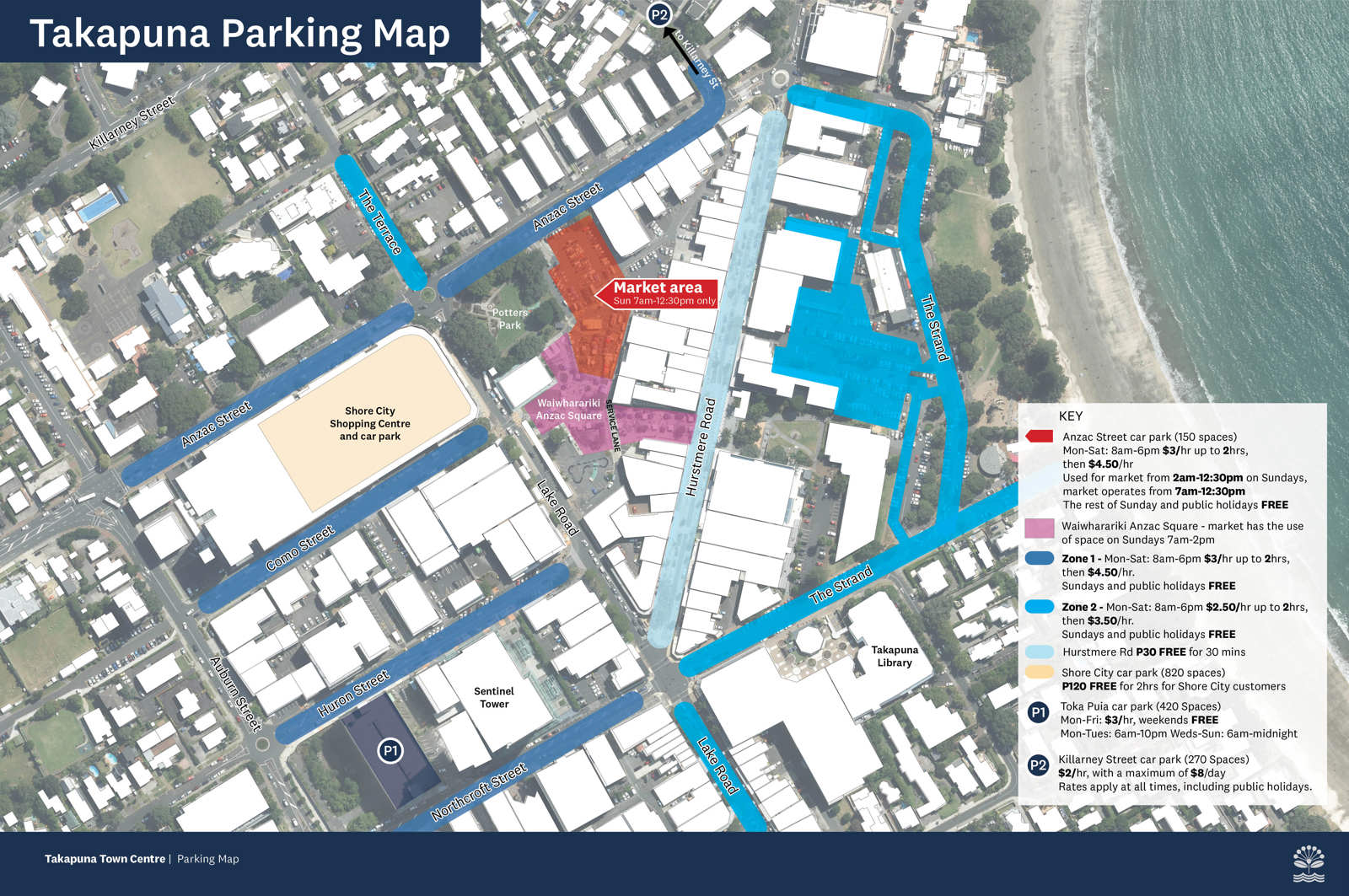 If you haven’t experienced Waiwharariki Anzac Square yet, make it a summer destination! Drop by the Takapuna Sunday Market (7am–12pm every Sunday, excluding 28 December only), enjoy the Māori art and greenery, and soak up the atmosphere. It’s easy to get there by bus, and if you’re driving, check out the parking map below.