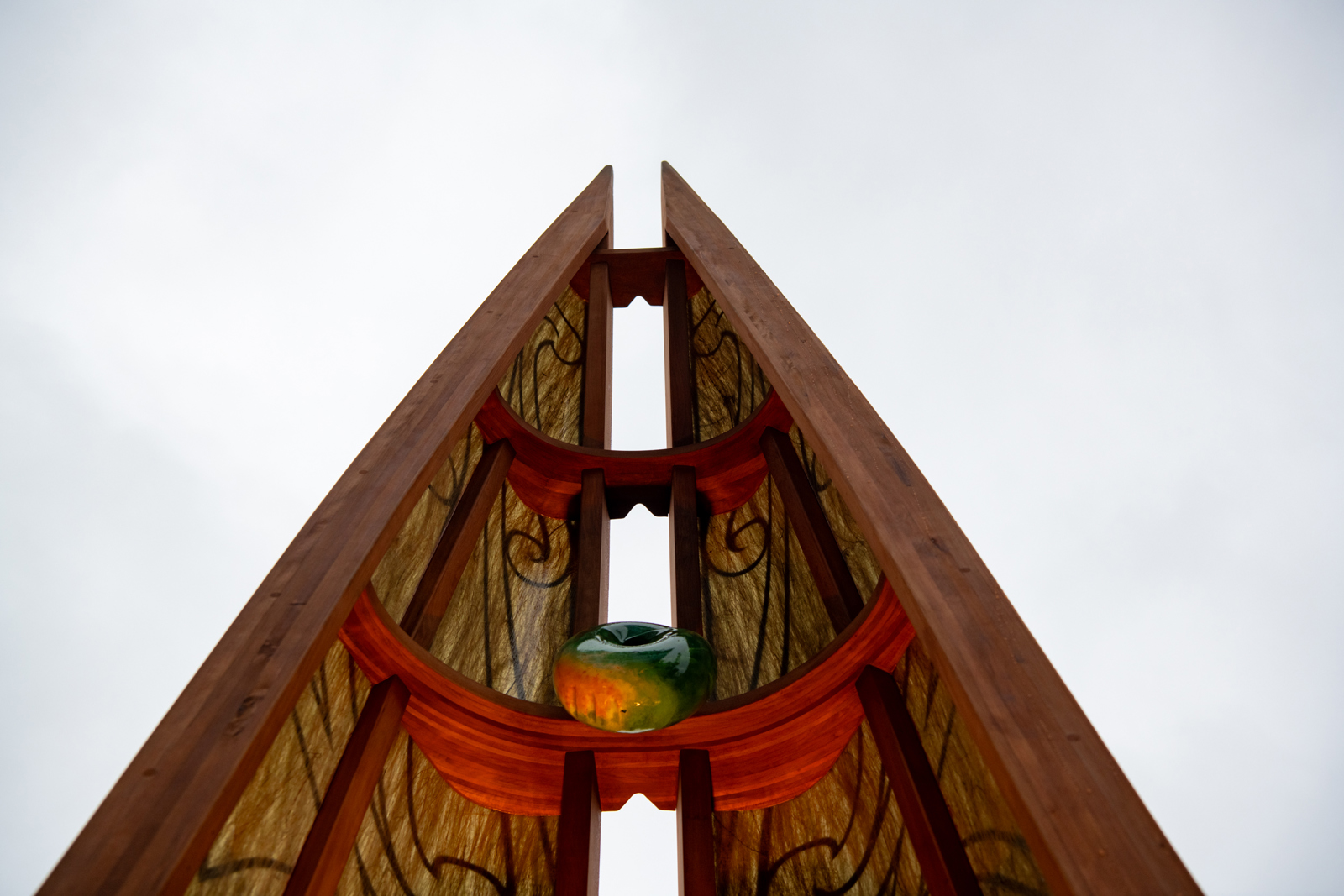 Protecting the lower third of each hull are representations of pā tūwatawata (defensive fencing), evoking the early settlements and numerous pā sites that once stood in the area.
