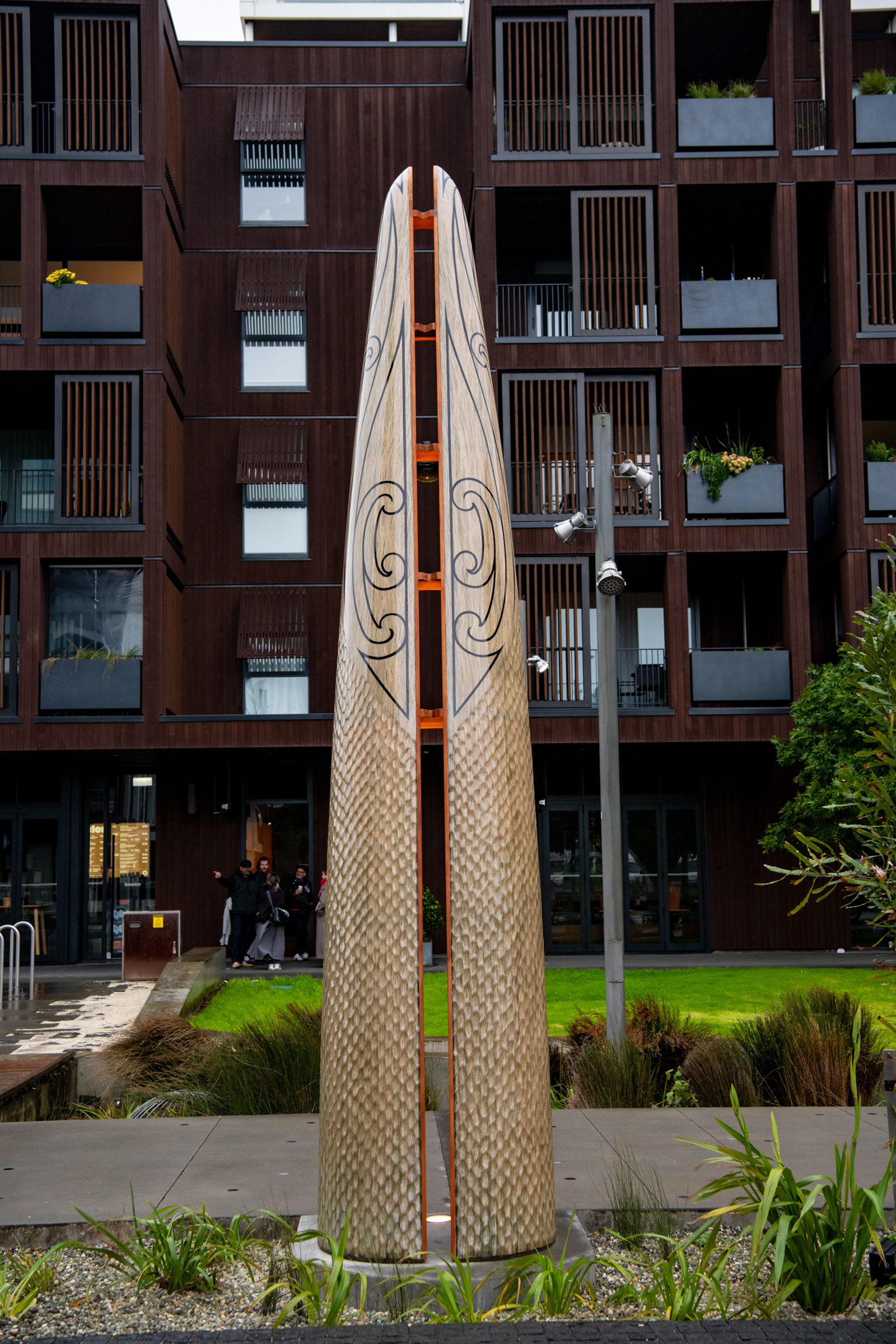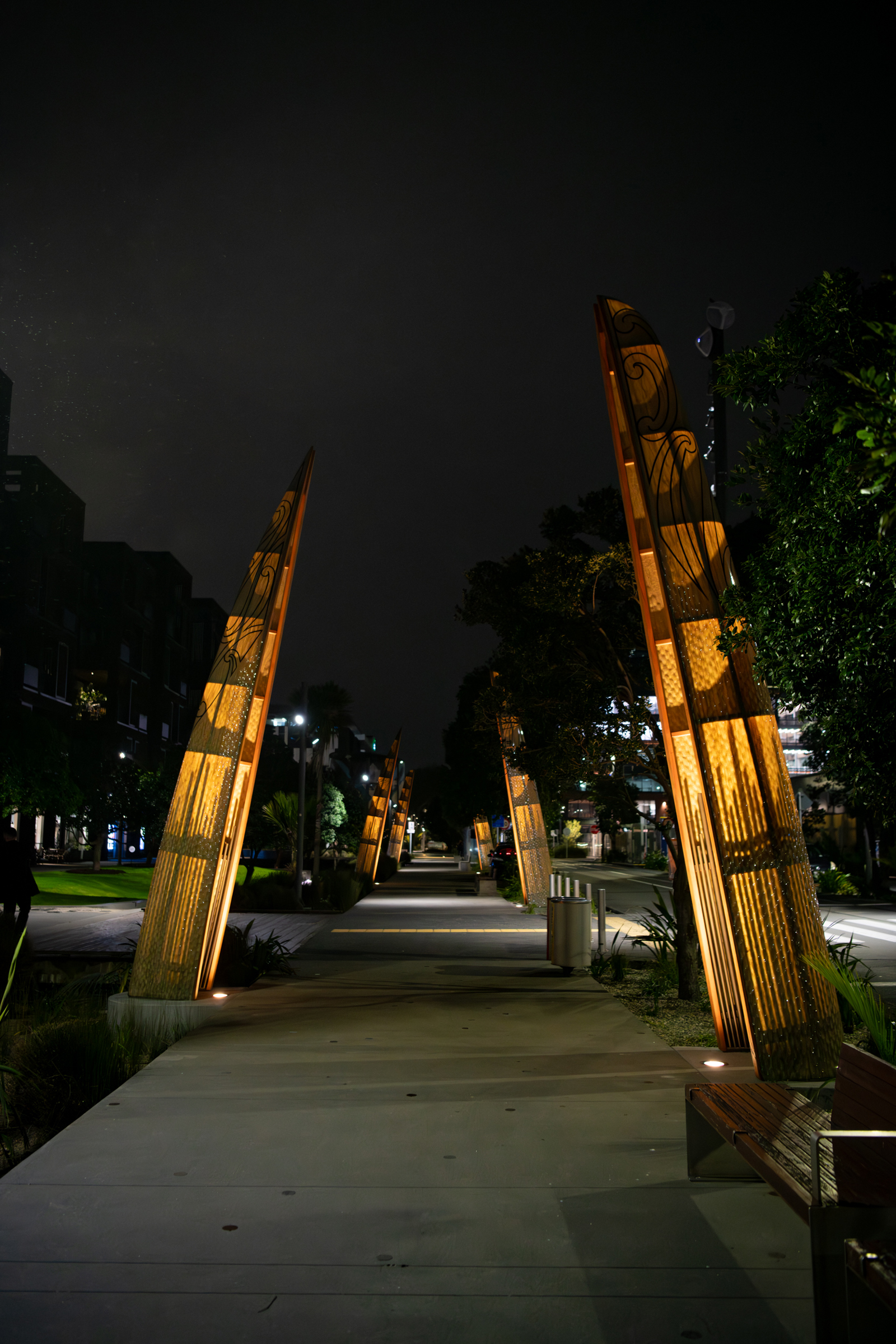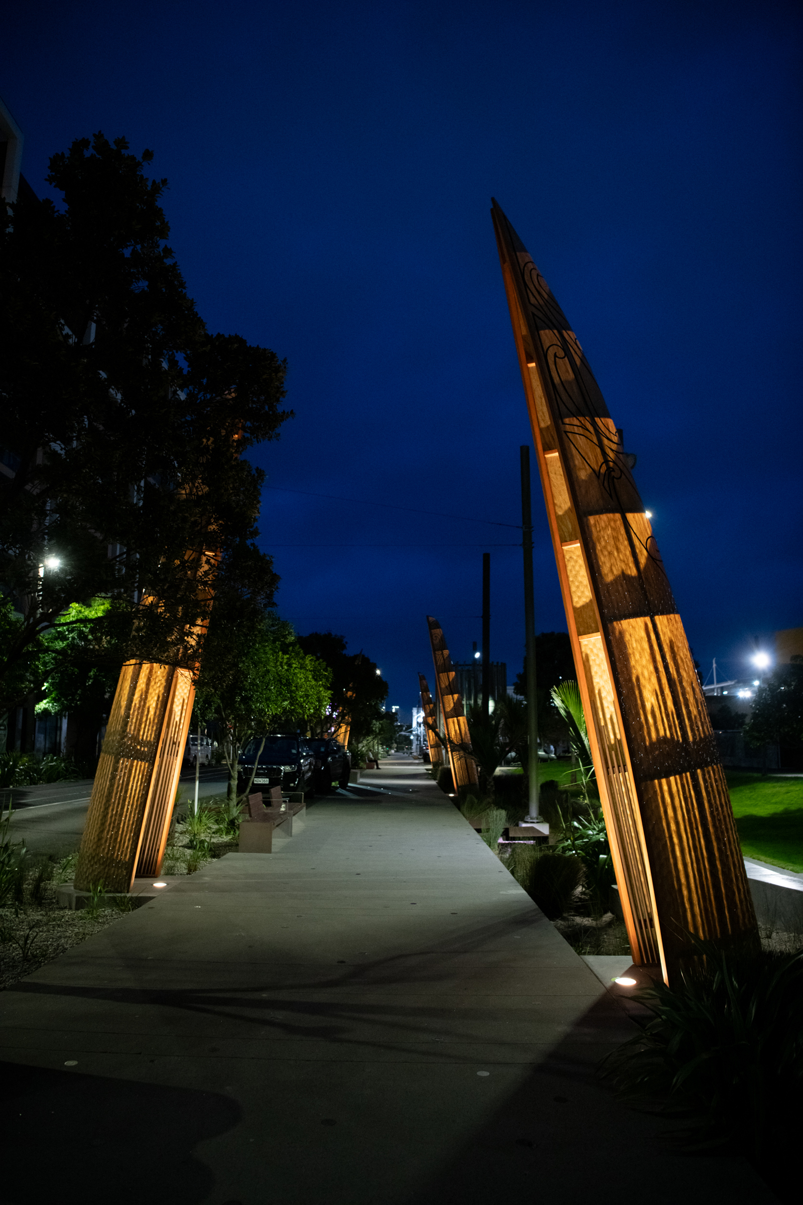The striking hulls are placed vertically in the rain gardens on the eastern side of Daldy Street in a taratara-a-kae (zig-zag) formation, creating an immersive experience along the pedestrian pathway.