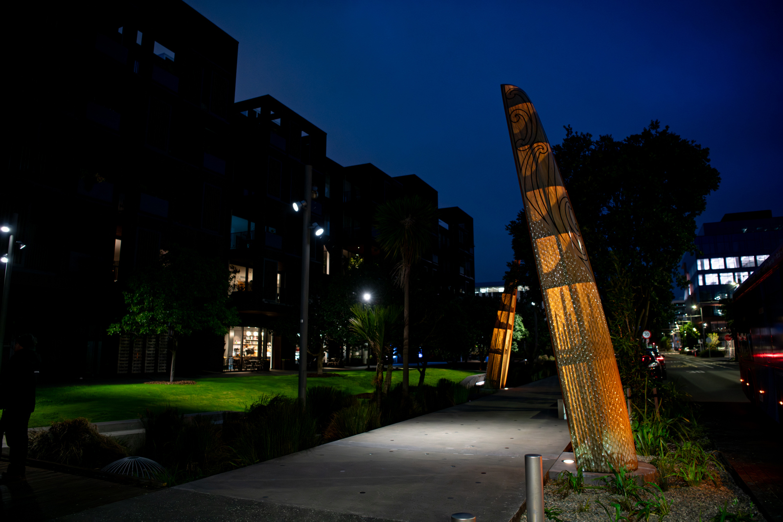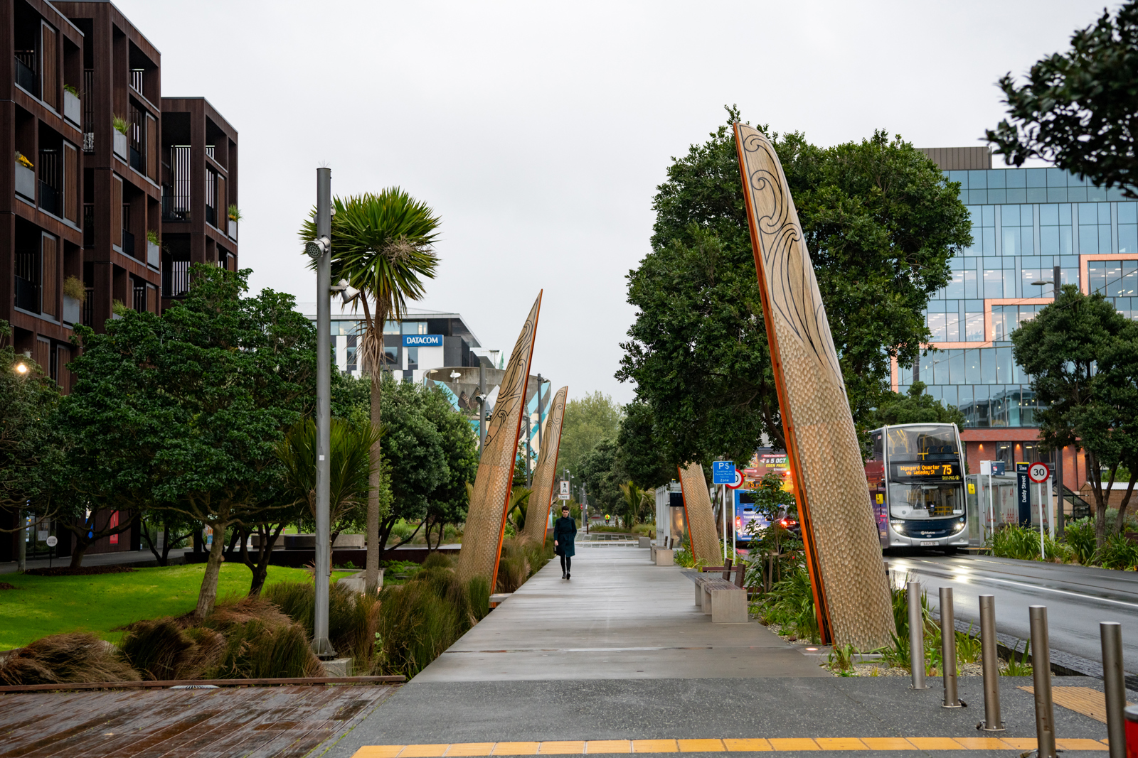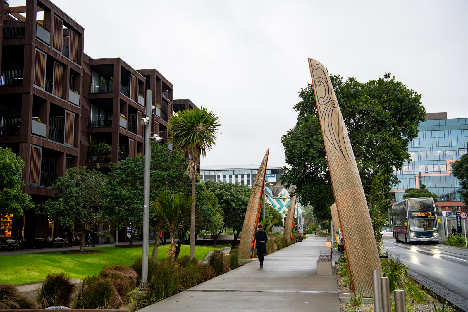 The striking hulls are placed vertically in the rain gardens on the eastern side of Daldy Street in a taratara-a-kae (zig-zag) formation, creating an immersive experience along the pedestrian pathway.